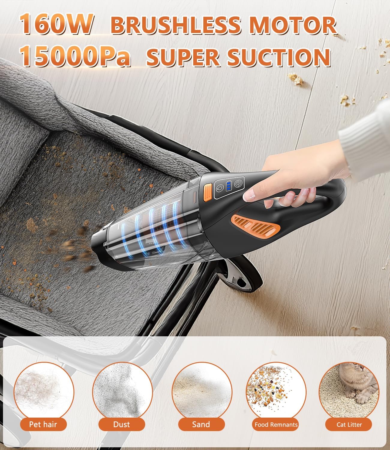 - ➤[15Kpa Hand Held Car Vacuum]: handheld vacuum cordless is equipped with a 160W digital motor, which can reach a super suction power of 15Kpa, and 2 speeds to meet all your cleaning needs. Really a great vacuum cleaner for home, car, office, camping and trip.